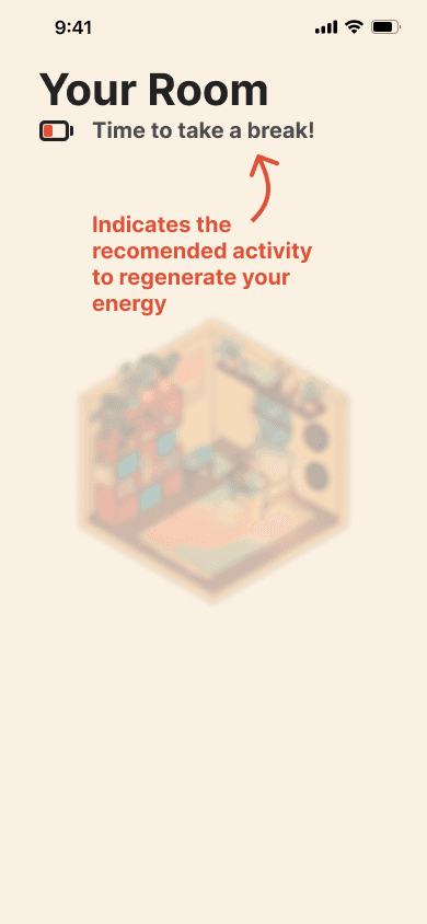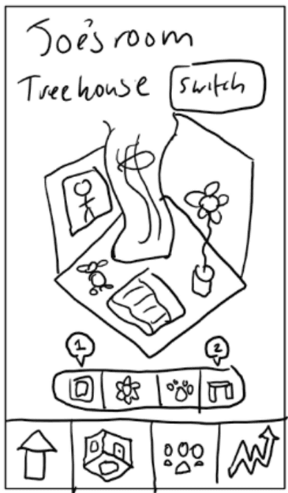The home page primarily displays the user's room, allowing them to establish a deeper connection with their pet and customise the room's aesthetics.