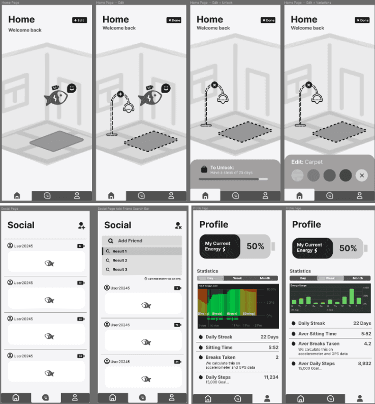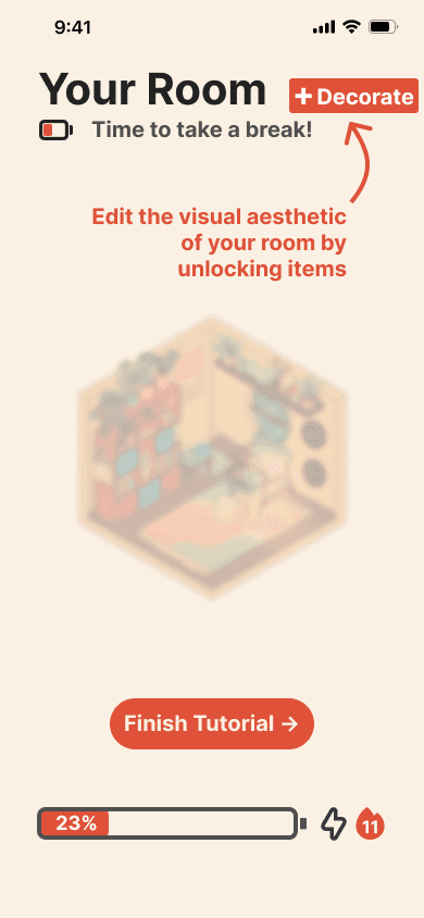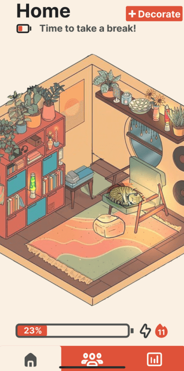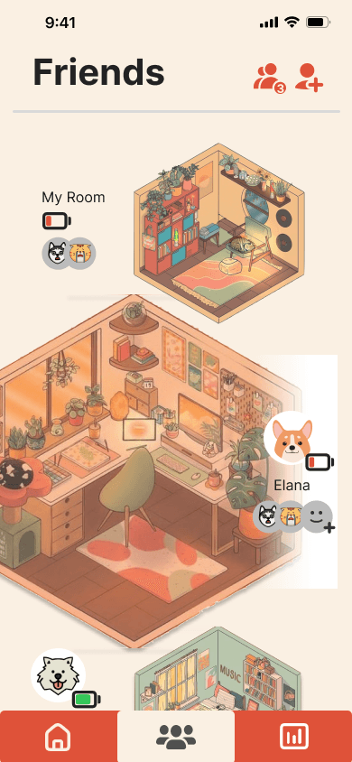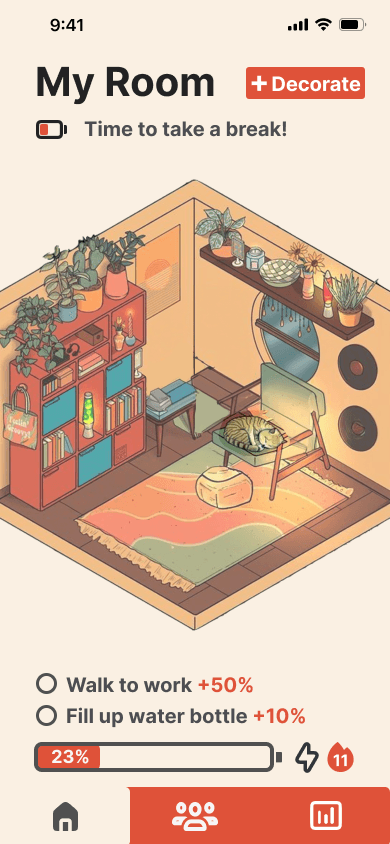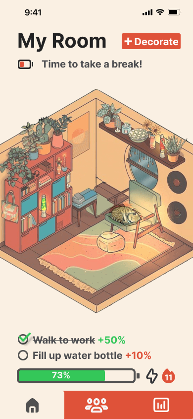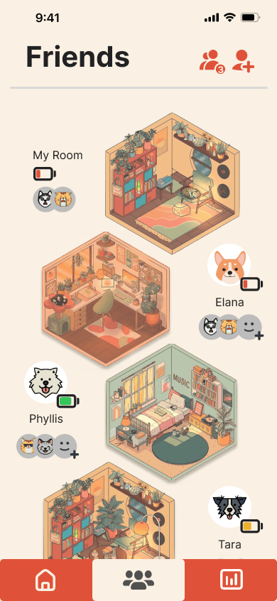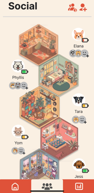 Having a social element where users can connect with friends and share progress adds a layer of insentive, in which friends can share and compare pets and rooms.