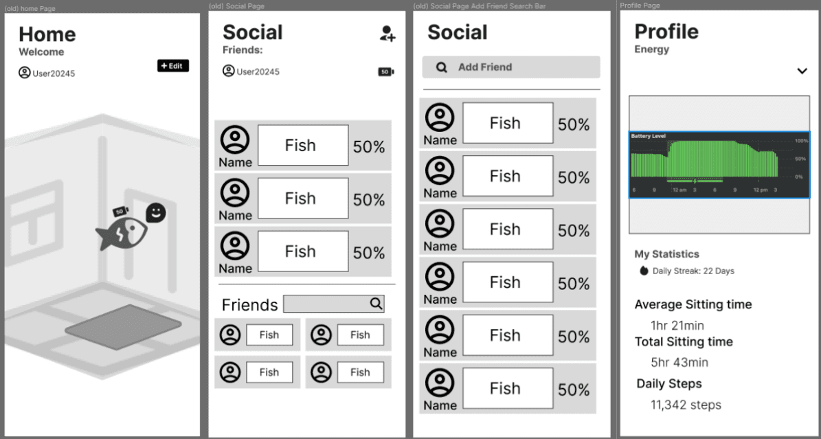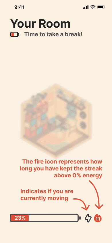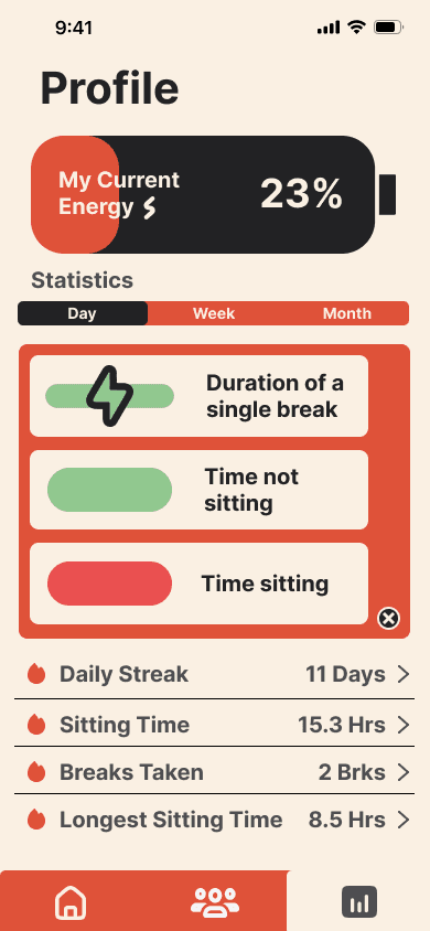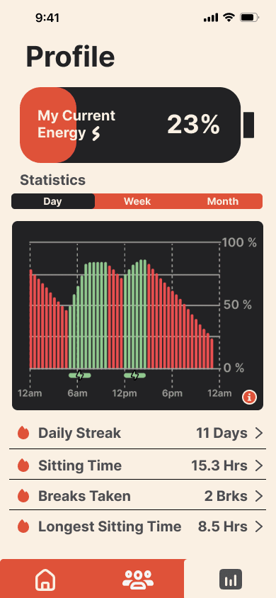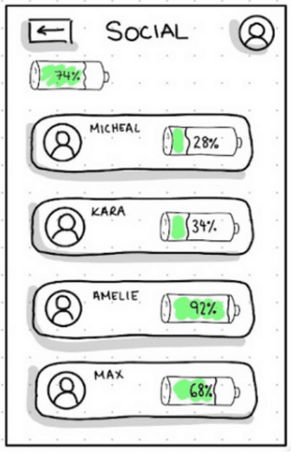 We really liked the design of having the battery filling up to showcase the amount of energy left for the user and having it in the social page as well is a quick and easy indicator compared to having a full graph.